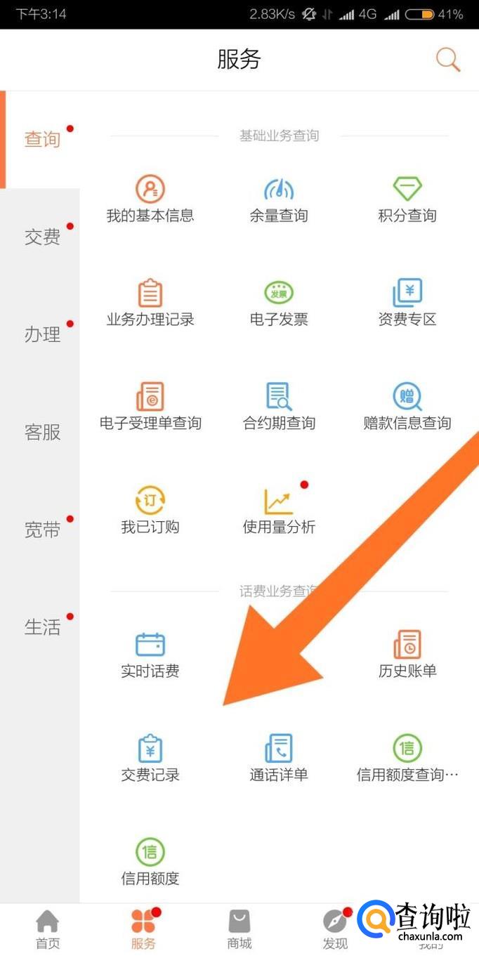接着在“服务”页面点击“实时话费”或者“交费记录”。