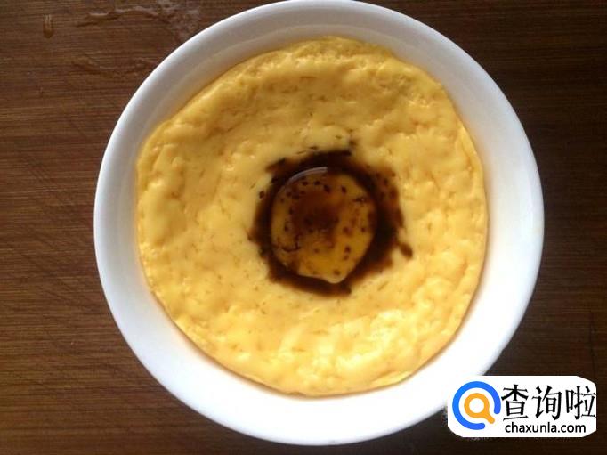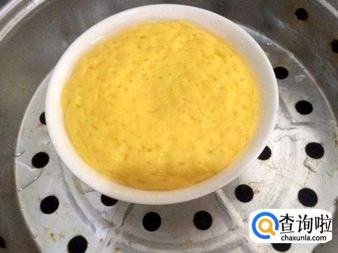 将鸡蛋液上蒸锅蒸熟。图中水蒸蛋蒸制时间过长,有点老了。一般水蒸蛋蒸十五分钟左右即可。