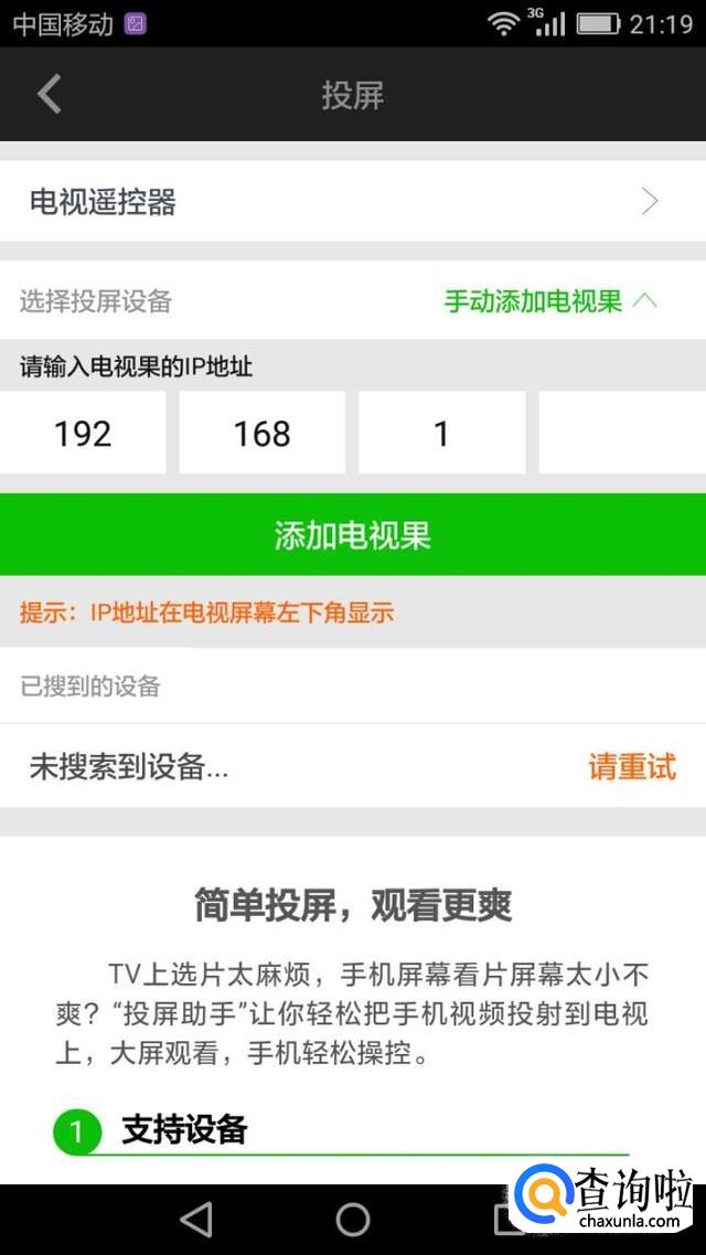 将手机靠进电视,手机搜索到电视时可直接投屏,手机没有搜索到电视时可以输入电视的IP地址实现投屏。