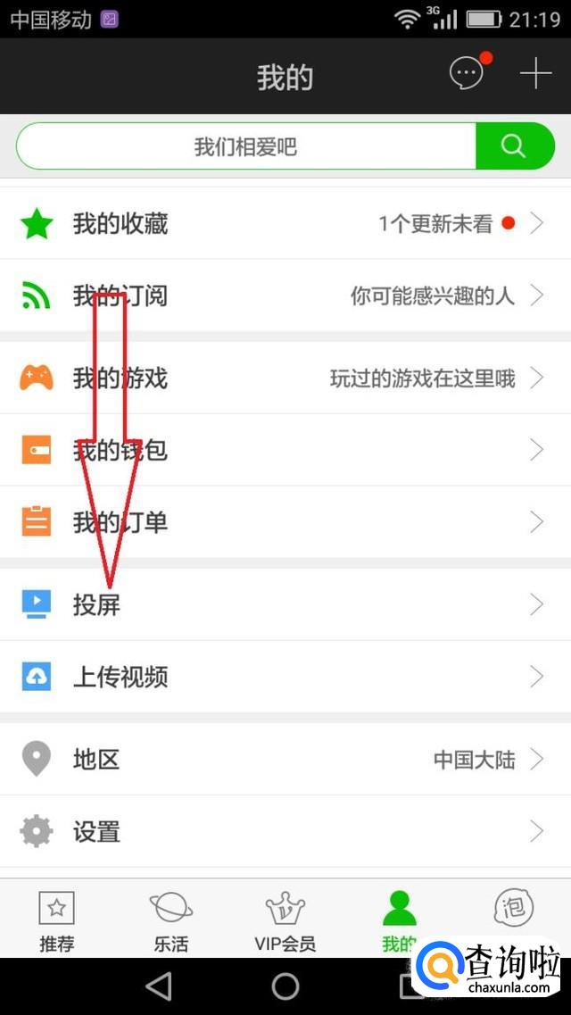 我们还可以直接在视频APP上将手机上的视频投到电视上。打开视频APP,在“我的”界面点击投屏。(图片通过爱奇艺APP进行演示)