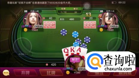 关于诈金花来了大牌的问题,来了大牌不管是蒙的还是明着看的,尽量别先加码,一定把握好火候,什么时候该涨,什么时候不该涨。别担心赢不了码,你要是先涨了,人对方牌小就跑了,你会一点也捞不到的。这样你不涨码,对方看码少也许会想:多赢一点是一点,他也会沉不住气的。哈哈......这个时候你的机会就来了。
