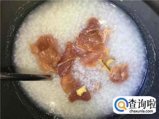 把白粥煮好后,倒入腌制好的瘦肉,按煮粥模式,先把瘦肉煮熟。