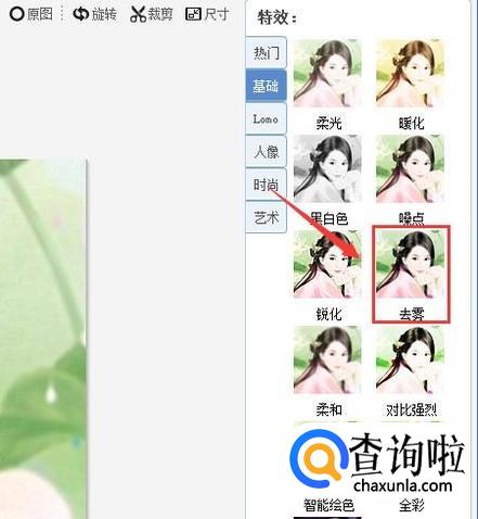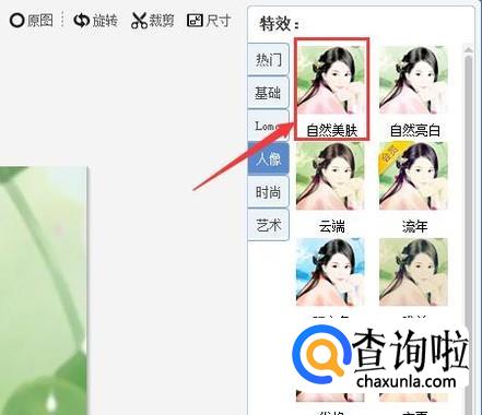 点击智能磨皮,图片就自动进行磨皮操作,然后再找到人像选项内的自然美肤选项,如图所示: