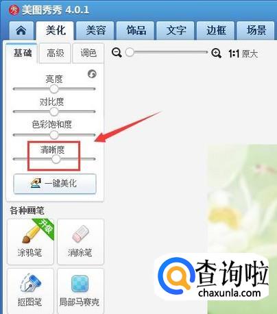 在该界面内找到美化选项,并在其内找到清晰度选项,如图所示: