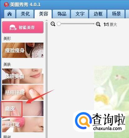 再找到美容菜单,并在其内找到磨皮选项,如图所示: