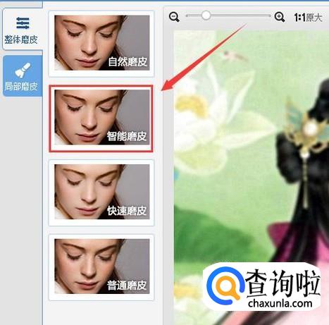点击磨皮选项,在弹出的对话框内选择智能磨皮选项,如图所示: