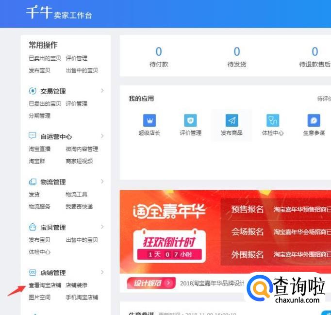 在左边的菜单栏,找到店铺管理,可以看到“查看淘宝店铺”,可从这里直接进入自己的店铺,这是方法一。