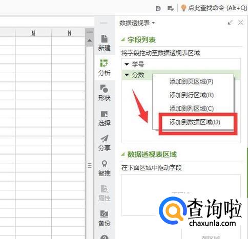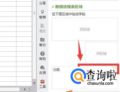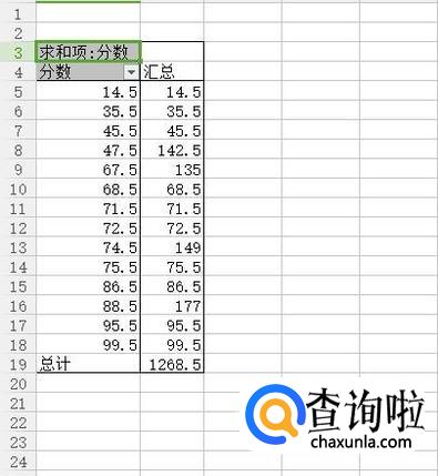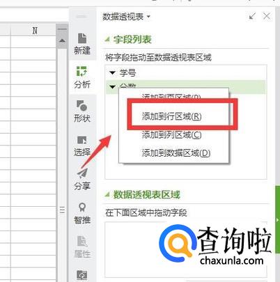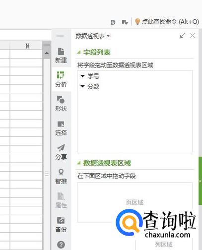 这样表格中的数据先暂时没有了。在表格的右侧的分析中可以看到数据透视表的设置。将字段列表中的分数添加到行区域和添加到数据区域。添加完以后如图所示。