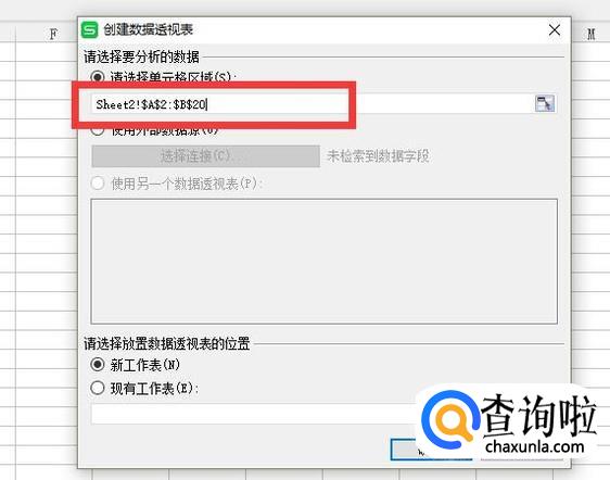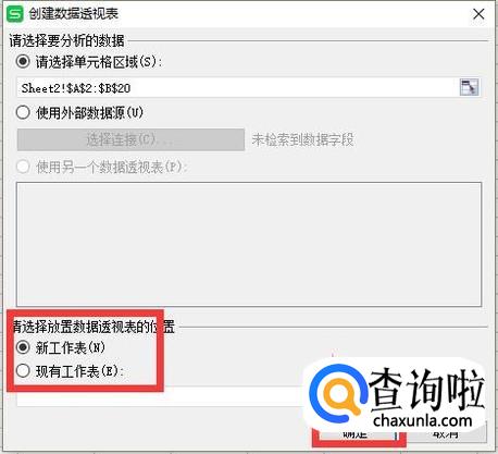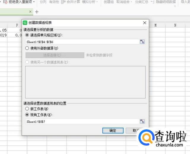接着,在界面中会弹出创建数据透视表的面板。之前我们选择的数据,就会显示在单元格区域中。在下方可以选择数据透视表的位置,可以选择新工作表和现有工作表,这里选择现有工作表就可以了。点击下方的确定按钮。