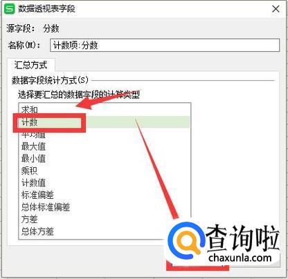 之后,界面中就会弹出一个数据透视表字段。在数据字段统计方式中选择计数。再点击确定按钮。