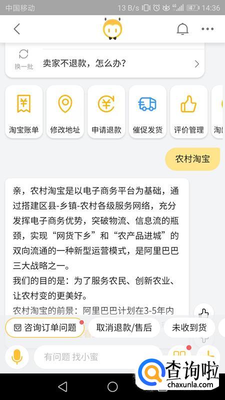之后我们输入农村淘宝,它就会发送农村淘宝的信息给我们了。