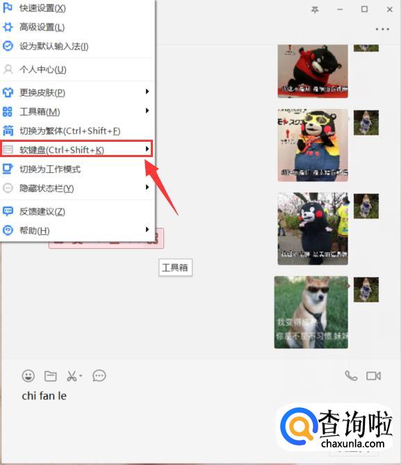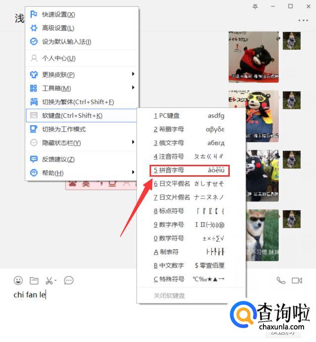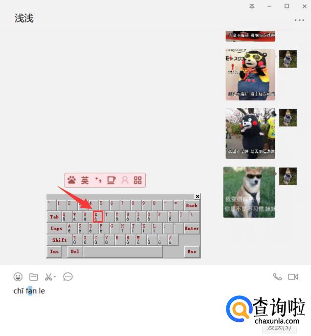 然后我们点击聊天窗口,输入任意你想要输入的拼音,比如小编就在这里输入【chi fan le].