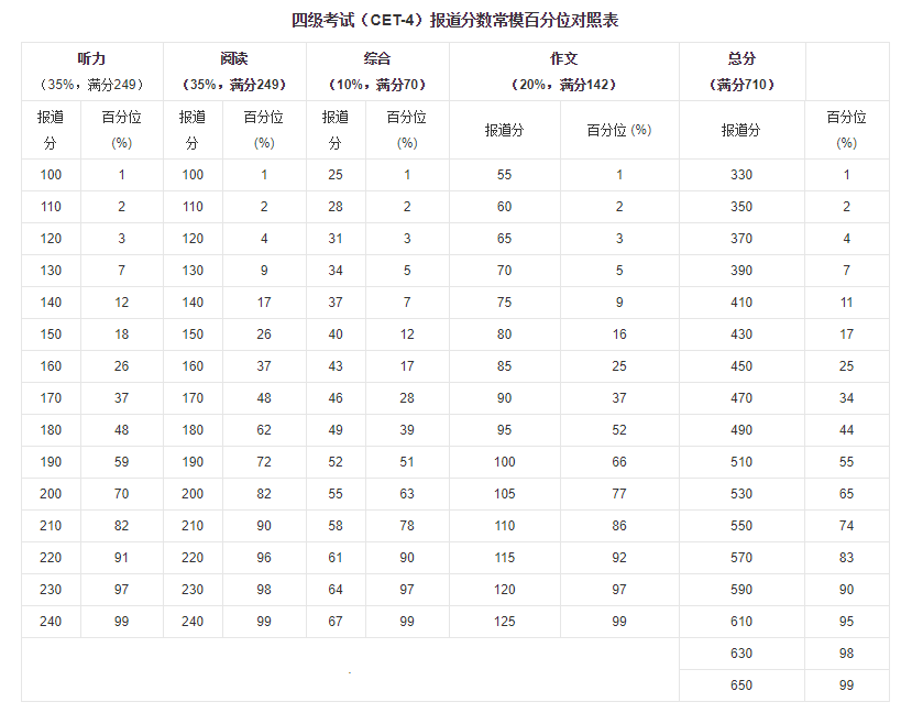 英语四级各档的分数分布是:听力(35%)249分、阅读(35%)249分、写作和翻译(30%)212分。