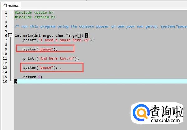接下来在C文件中我们写入如下图的语句,注意system方法中的pause参数就是暂停的意思,如下图所示
