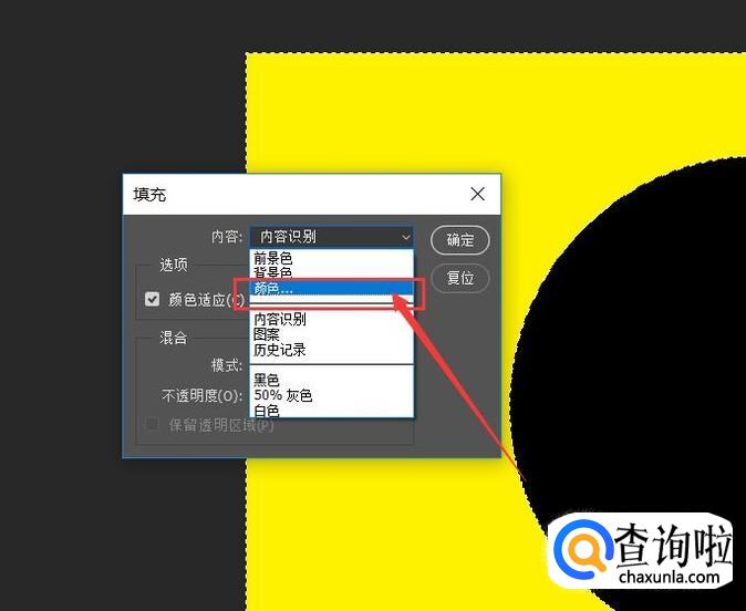 在内容选择上,我们点击选择填充内容为“颜色”选项,然后打开颜色拾取器。