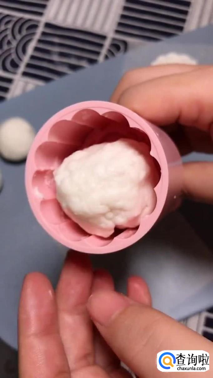接着用月饼模具挤压面团,如下图所示。