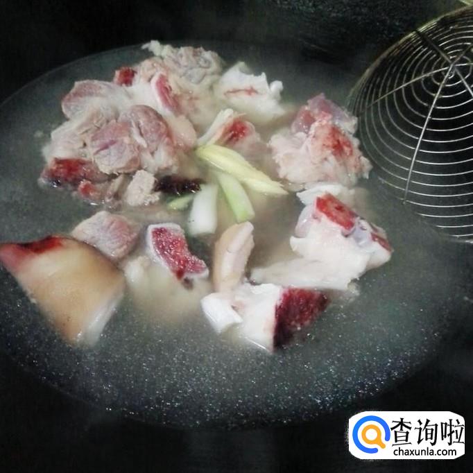 烧半锅水,水里面加二根葱白,二粒八角,一勺盐,几片生姜,等猪手的肉色变成白色后用捞子捞出来控水备用。