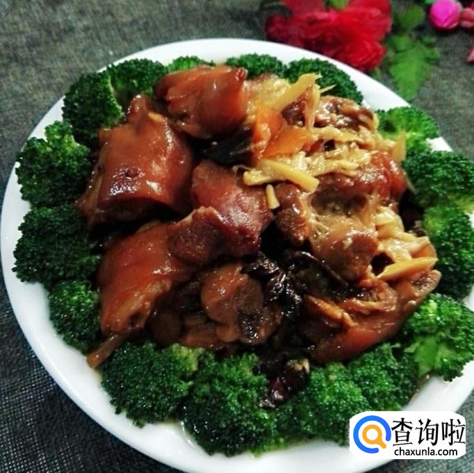 时间到了,关火,等高压锅里面的水蒸气出完后再把猪脚装在盘子里,把西兰花放在盘子的周围。