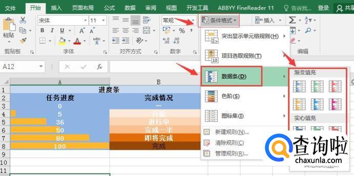 选择完成情况下的数据,一个个单元格设置填充颜色。点击【开始】-【条件格式】-【突出显示单元格规则】-【等于】,输入对应的文本,再填充颜色,选择自定义颜色。以下单元格以此类推,颜色由浅到深填充即可。