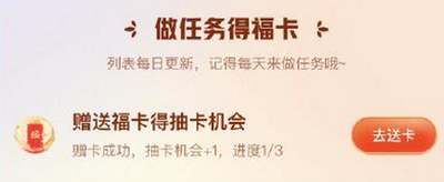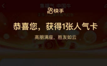 进入快手“集福气”活动界面后,玩家可以点击抽卡,获取卡片。总共五张卡片,每次抽奖都将随机获得一张卡。如果抽卡次数不够了,可以通过做任务来获取抽卡机会。另外,如果自己的好友有运气卡的话,也可以让好友赠送给你运气卡。