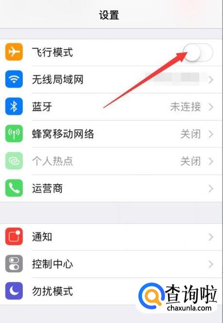 第一个方法是打开和关闭飞行模式;打开苹果手机的设置,进入之后一个办法就是打开自己的飞行模式,然后关闭,看看自己的信号服务有没有恢复