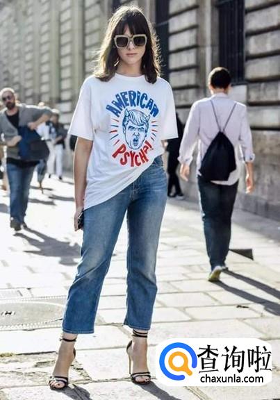 侧塞式:牛仔裤和宽T恤最适合这种塞法了,将宽大的T恤的侧面塞入牛仔裤中,打造悠闲慵懒风。