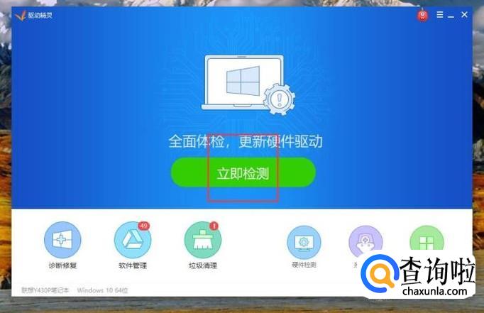 这里我们使用驱动精灵软件来安装无线网卡驱动程序,双击打开驱动精灵软件主页面,选择“立即检测”菜单。