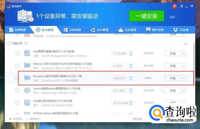 接下来,查看无线网卡设备的驱动程序安装情况,点击“升级”按钮。