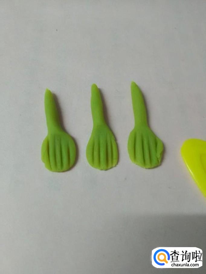 用小刀在按扁的彩泥上面刻一些竖线,表示绣球穗子。
