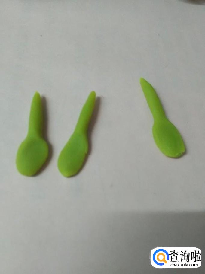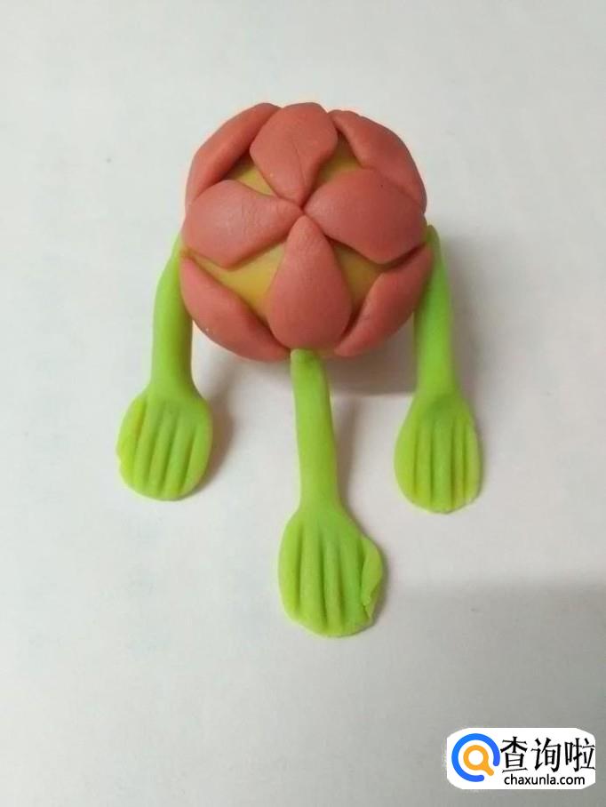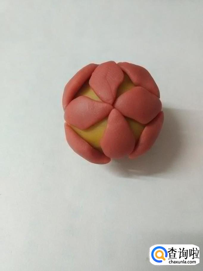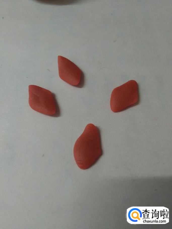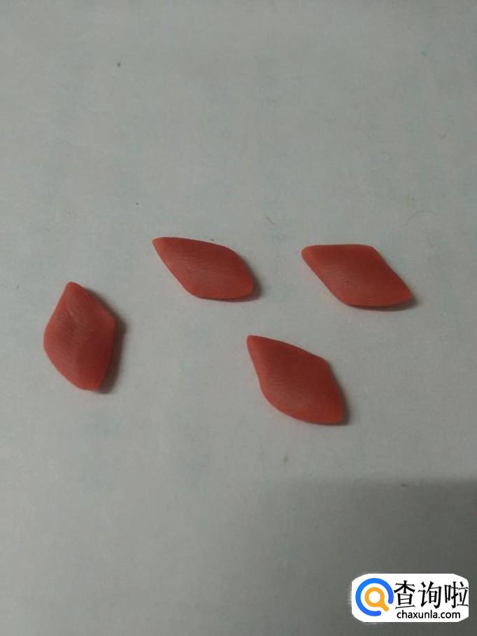 把四个圆球捏成四个菱形的花瓣,捏的时候,两端用拇指和食指挤一下,就成了花瓣的尖。