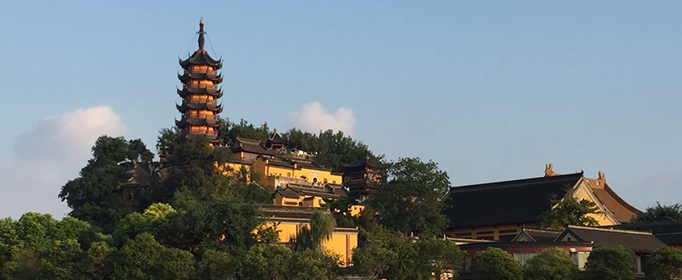 金山寺位于今江苏镇江市区西北的金山上,始建于东晋,高四十四米,周长五百二十米,距市中心三公里。金山寺布局依山就势,使山与寺融为一体。寺内主要建筑为天王殿、大雄宝殿、观音阁、藏经楼、方丈室等。金山寺自创建以来,经历代修葺,古迹甚多,其中主要有:慈寿塔、法海洞、妙高台、楞伽台(又名苏经楼)、留云亭(又名“江天一览亭”)等。