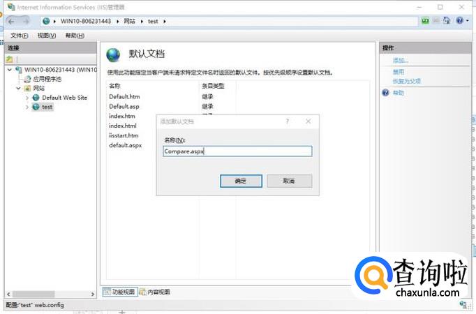 在网站的“功能视图”中双击“默认文档”→在呈现的对话框中输入默认文档的文件名。