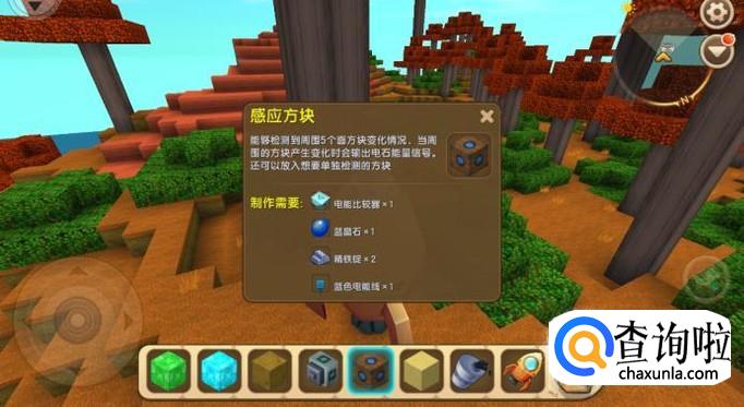 而感应方块是由电能比较器、蓝晶石、精铁锭和蓝色电能线制作而成的,如图所示。