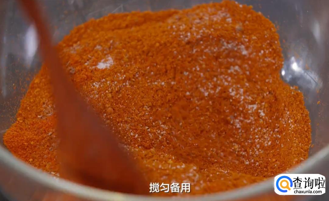 制作调味粉:将朝天椒辣椒面、花椒面、盐、二荆条辣椒面混合,搅拌均匀备用。
