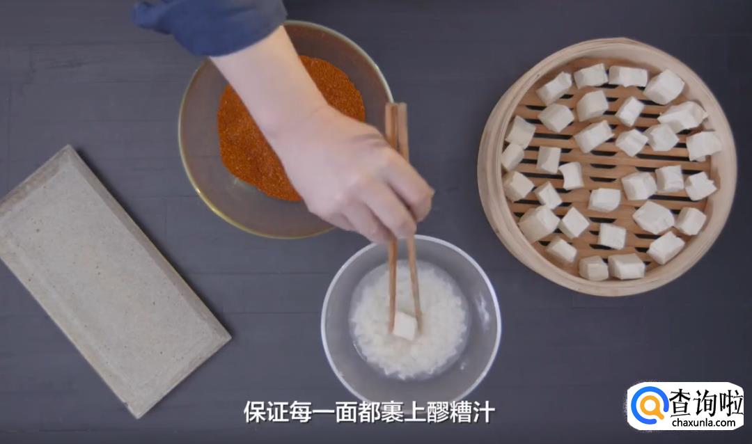 接下来,将蒸好的豆腐,逐个放在醪糟汁里打个滚,保证每一面都裹上醪糟汁;再放到调味粉碗里,让豆腐每一面都均匀地裹上一层调味粉。