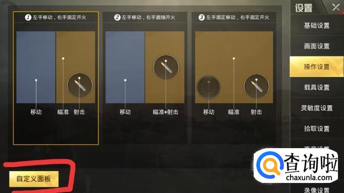 在操作设置中有三种系统默认设置可选择,想自己调整按键位置,点击左下角的自定义面板即可。
