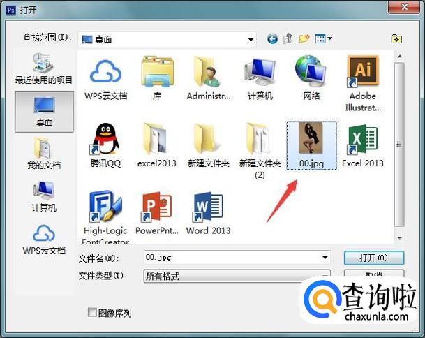 我们首先将ps打开,然后再按下Ctrl+O键在弹出的对话框内找到我们的图片素材,如图所示: