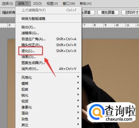 打开图片之后在菜单那里找到滤镜选项,点击该选项在其下拉菜单里找到液化选项,如图所示: