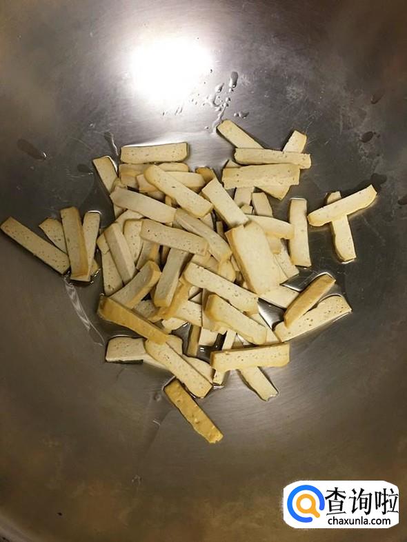 芹菜掐去根部,摘去老叶,留下嫩叶,再将茎掐成小段,洗净待用。