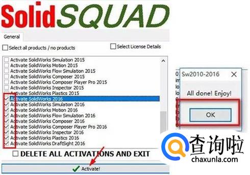 选中所有sw2016项目,点最下方“√Activate”.弹出小窗口后,点OK
