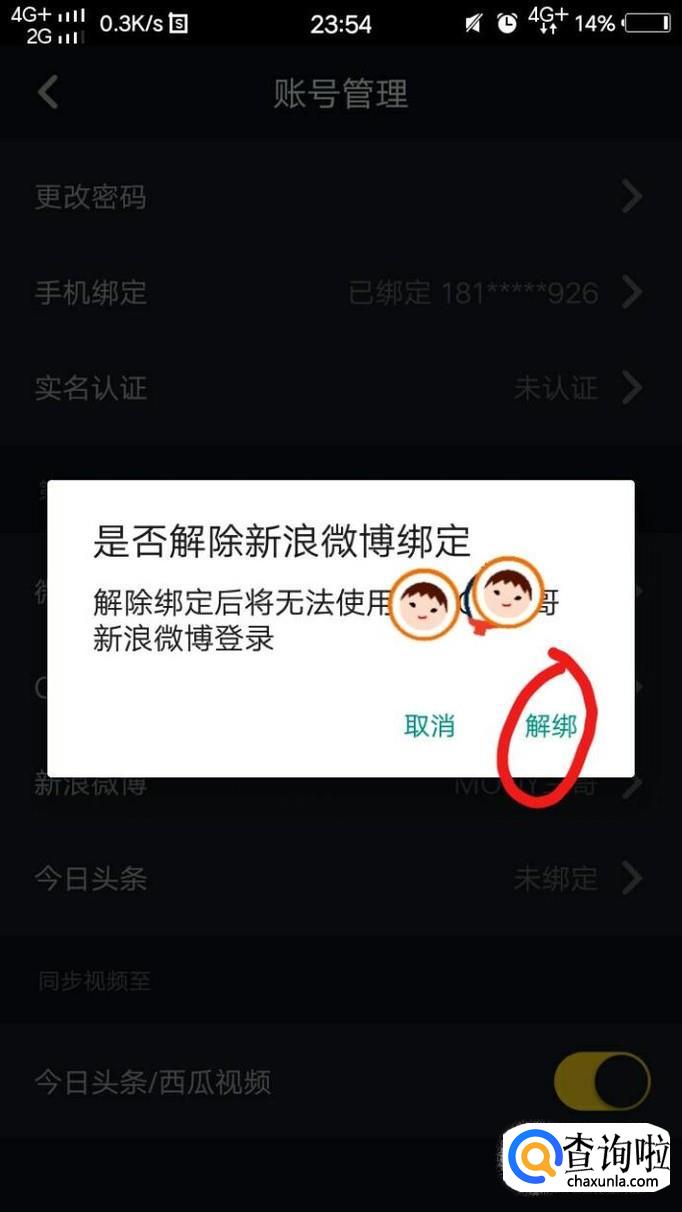 最后,点击"新浪微博",就会跳出解除绑定的提示,点击"解除"即可。