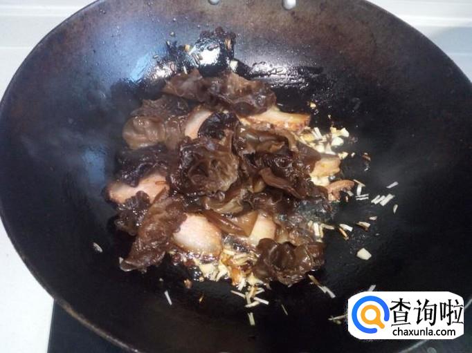 炒至腊肉透明,发亮光,放入木耳快速翻炒。