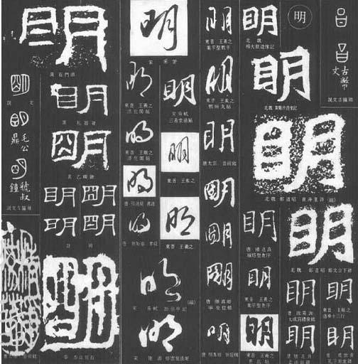 “明”字最常见的有三种写法:明、眀、朙。我们现在使用的“明”字,最早出现在甲骨文中。《易经》里说:“日月相推,而明生焉。”“明”字出现的虽早,然而在很早以前的古代,“眀”、“朙”的写法更为常见。唐代颜元孙《干字书》中只收入“眀”、“朙”两种写法,注曰“上通下正”,即“朙”为正字,“眀”为通字。