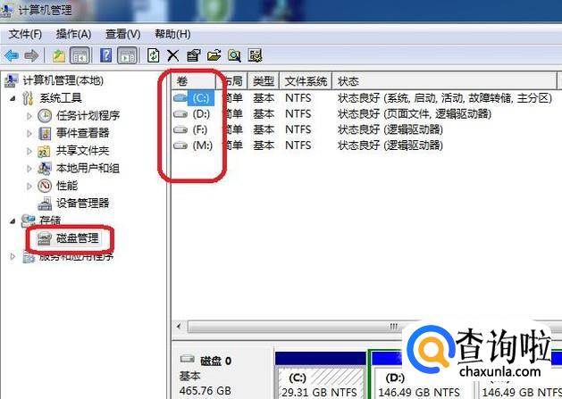 进入计算机管理后,我们点击左侧的“磁盘管理”,就能看到当前计算机的所有磁盘。