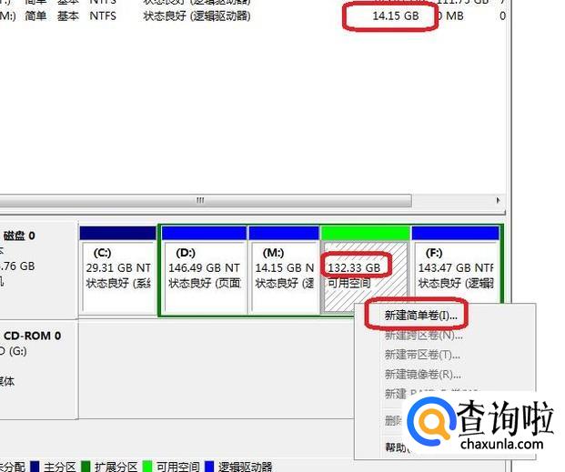 压缩之后,我们多出一个132G的绿色可用空间,如图所示,我们右键点击该空间,选择“新建简单卷”。