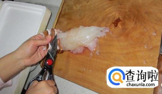 接着把腹部拉断成两截,这里大家可以用刀了,先把里面肉划掉比较容易拉下来。