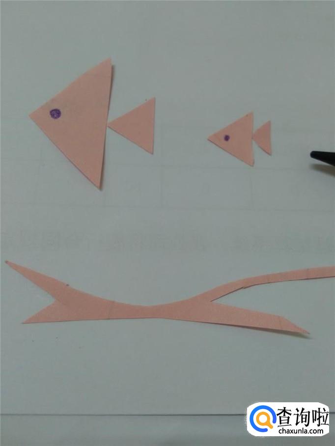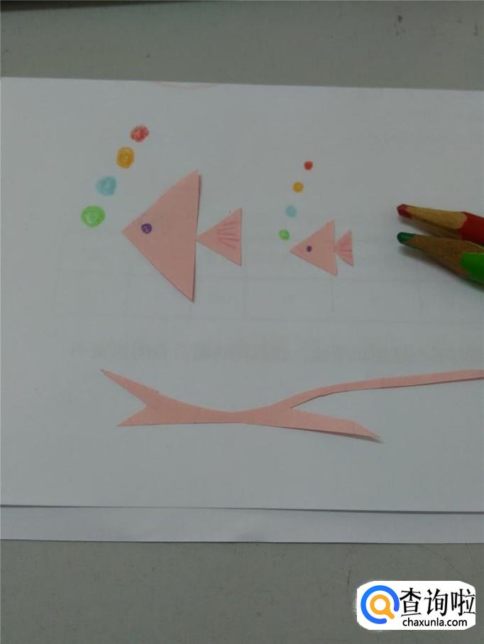 把最大的一个三角形用胶棒粘在纸的左边,当作大燕鱼的身体。