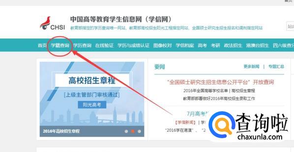 在学信网主页上方找到图示位置的“学籍查询”并点击进入登陆界面。