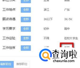 假设,你想要兼职的,那么,在该页面的“工作性质”这里,点击:兼职;下面即会弹出兼职的职位。