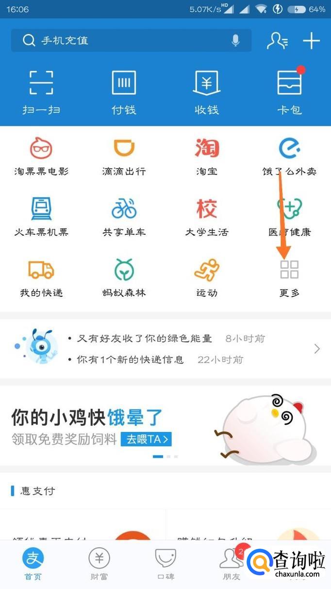 打开支付宝APP,点击主页的更多功能(不是充值)。